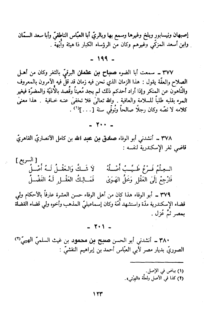 377 - سَمِعت أَبَا الضَّوْءِ صَبَاحَ بْنَ عُثْمَانَ الْبَرْقِيَّ بِالثَّغْرِ وَكَانَ مِنْ أَهْلِ الصَّلَاحِ وَالْعِفَّةِ يَقُولُ هَذَا الزَّمَانُ الَّذِي نَحْنُ فِيهِ زَمَانٌ قَدْ قَلَّ فِيهِ الْآمِرُونَ بِالْمَعْرُوفِ وَالنَّاهُونَ عَنِ الْمُنْكَرِ وَإِذَا أَرَادَ أَحَدُكُمْ ذَلِكَ لَمْ يَجِدْ مُعِينًا وَقُصِدَ بِالْأَذِيَّةِ وَالْمَضَرَّةِ فَيُغَيِّرُ الْمَرْءُ بِقَلْبِهِ طَلَبًا لِلسَّلَامَةِ وَالْعَافِيَةِ