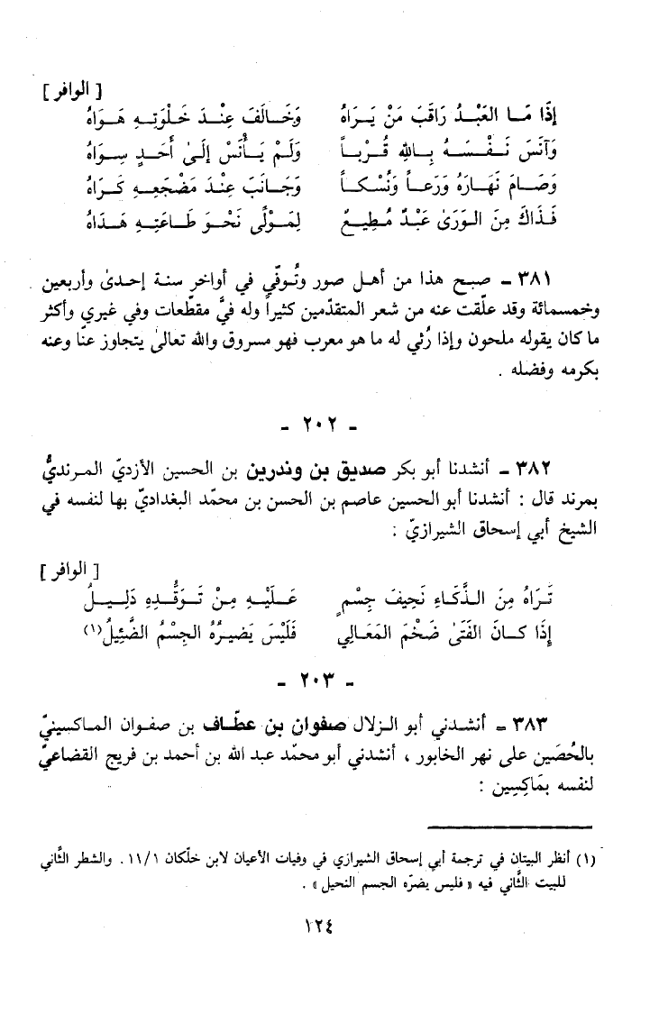 382 - أَنْشَدَنَا أَبُو بَكْرٍ صَدِيقُ بْنُ وَنْدَرِينَ بْنِ الْحُسَيْنِ الْأَزْدِيُّ الْمَرَنْدِيُّ بِمَرَنْدَ قَالَ أَنْشَدَنَا أَبُو الْحُسَيْنِ عَاصِمُ بْنُ الْحَسَنِ بْنِ مُحَمَّدٍ الْبَغْدَادِيُّ بِهَا لِنَفْسِهِ فِي الشَّيْخِ أَبِي إِسْحَاقَ الشِّيرَازِيِّ