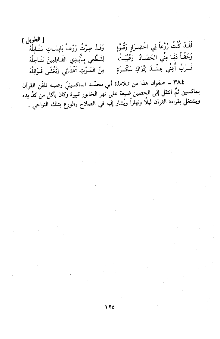 384 - صَفْوَانُ هَذَا مِنْ تَلَامِذَةِ أَبِي مُحَمَّدٍ الْمَاكِسِينِيِّ وَعَلَيْهِ تَلَقَّنَ الْقُرْآنَ بِمَاكِسِينَ ثُمَّ انْتَقَلَ إِلَى الْحُصَيْنِ ضَيْعَةٌ عَلَى نَهْرِ الْخَابُورِ كَبِيرَةٌ وَكَانَ يَأْكُلُ مِنْ كَدِّ يَدِهِ وَيَشْتَغِلُ بِقِرَاءَةِ الْقُرْآنِ لَيْلًا وَنَهَارًا وَيُشَارُ إِلَيْهِ فِي الصَّلَاحِ وَالْوَرَعِ بِتِلْكَ النَّوَاحِي
