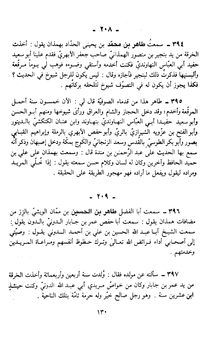 394 - سَمِعت طَاهِرَ بْنَ مُحَمَّدِ بْنِ يَحْيَى الْحَدَّادَ بِهَمَذَانَ يَقُولُ أَخَذْتُ الْخِرْقَةَ مِنْ يَدِ بِنْجِيرِ بْنِ مَنْصُورٍ الْهَمَذَانِيِّ صَاحِبِ جَعْفَرٍ الْأَبْهَرِيِّ فَقَدِمَ عَلَيْنَا أَبُو سَعِيدٍ حَفِيدُ أَبِي الْعَبَّاسِ النُّهَاوَنْدِيُّ فَكُنْتُ أَخْدِمُهُ وَأَسْتَقِي وُضُوءَهُ فَوَهَبَ لِي يَوْمًا مُرَقَّعَةً وَأَلْبَسْنِيهَا فَذَكَرْتُ ذَلِكَ لِبِنْجِيرَ فَأَجَازَهُ وَقَالَ لَيْسَ يَكُونُ لِلرَّجُلِ شُيُوخٌ فِي الْحَدِيثِ فَكَذَا يَجُوزُ أَنْ يَكُونَ لَهُ فِي التَّصَوُّفِ شُيُوخٌ لِتَلْحَقَهُ بَرَكَاتُهُمْ
