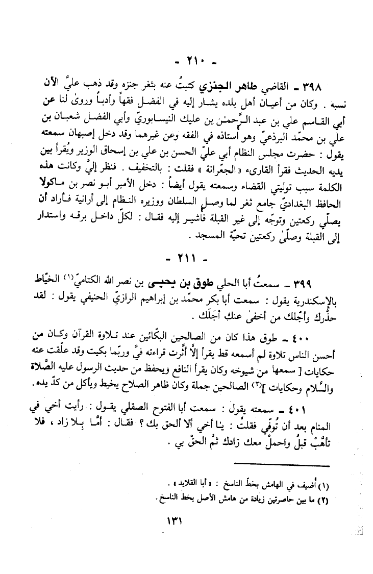 400 - طَوْقٌ هَذَا كَانَ مِنَ الصَّالِحِينَ الْبَكَّائِينَ عِنْدَ تِلَاوَةِ الْقُرْآنِ وَكَانَ مِنْ أَحْسَنِ النَّاسِ تِلَاوَةً لَمْ أَسْمَعْهُ قَطُّ يَقْرَأُ إِلَّا أَثَّرَتْ قِرَاءَتُهُ فِيَّ وَرُبَّمَا بَكَيْتُ وَقَدْ عَلَّقْتُ عَنْهُ حِكَايَاتٍ سَمِعَهَا مِنْ شُيُوخِهِ وَكَانَ يَقْرَأُ النَّافِعَ وَيَحْفَظُ مِنْ حَدِيثِ الرَّسُولِ عَلَيْهِ الصَّلَاةُ وَالسَّلَامُ وَحِكَايَاتِ الصَّالِحِينَ جُمْلَةً وَكَانَ ظَاهِرَ الصَّلَاحِ يَخِيطُ وَيَأْكُلُ مِنْ كَدِّ يَدِهِ