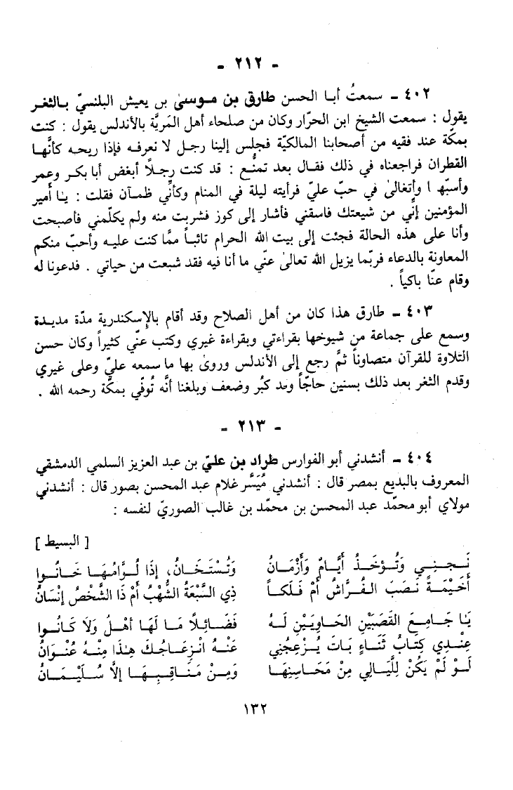 403 - طَارِقٌ هَذَا كَانَ مِنْ أَهْلِ الصَّلَاحِ وَقَدْ أَقَامَ بِالْإِسْكَنْدَرِيَّةِ مُدَّةً مَدِيدَةً وَسَمِعَ عَلَى جَمَاعَةٍ مِنْ شُيُوخِهَا بِقَرَاءَتِي وَبِقَرَاءَةِ غَيْرِي وَكَتَبَ عَنِّي كَثِيرًا وَكَانَ حَسَنَ التِّلَاوَةِ لِلْقُرْآنِ مُتَصَاوِنًا ثُمَّ رَجَعَ إِلَى الْأَنْدَلُسِ وَرَوَى بِهَا مَا سَمِعَهُ عَلَيَّ وَعَلَى غَيْرِي وَقَدِمَ الثَّغْرَ بَعْدَ ذَلِكَ بِسِنِينَ حَاجًّا وَقَدْ كَبُرَ وَضَعُفَ وَبَلَغَنَا أَنَّهُ تُوُفِّيَ بِمَكَّةَ رَحِمَهُ اللَّهُ