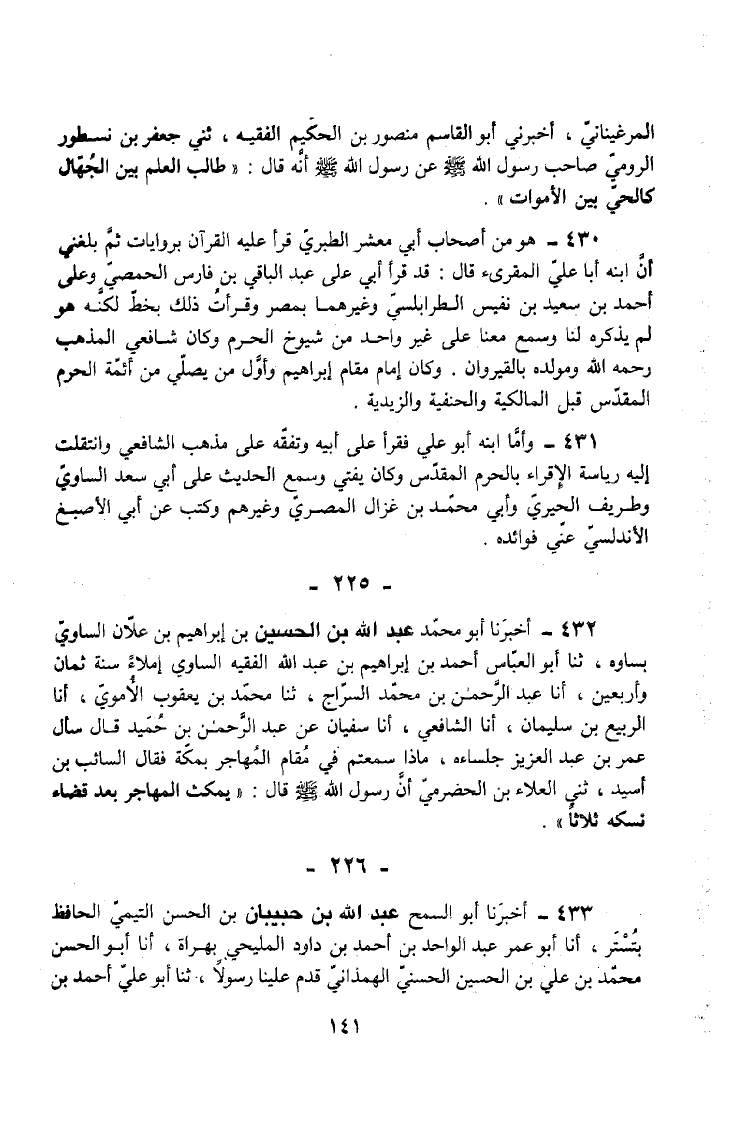 432 - أَخْبَرَنَا أَبُو مُحَمَّدٍ عَبْدُ اللَّهِ بْنُ الْحُسَيْنِ بْنِ إِبْرَاهِيمَ بْنِ عَلان الساوي بساوه ثَنَا أبوالعباس أَحْمَدُ بْنُ إِبْرَاهِيمَ بْنِ عَبْدِ اللَّهِ الْفَقِيهُ السَّاوِيُّ إِمْلَاءً سَنَةَ ثَمَانٍ وَأَرْبَعِينَ أَنَا عَبْدُ الرَّحْمَنِ بْنُ مُحَمَّدٍ السَّرَّاجُ ثَنَا مُحَمَّدُ بْنُ يَعْقُوبَ الْأُمَوِيُّ أَنَا الرَّبِيعُ بْنُ سُلَيْمَانَ أَنَا الشَّافِعِيُّ أَنَا سُفْيَانُ عَنْ عَبْدِ الرَّحْمَنِ بْنِ حُمَيْدٍ قَالَ سَأَلَ عُمَرُ بْنُ عَبْدِ الْعَزِيزِ جُلَسَاءَهُ مَاذَا سَمِعْتُمْ فِي مُقَامِ الْمُهَاجِرِ بِمَكَّةَ فَقَالَ السَّائِبُ بْنُ أُسَيْدٍ ثَنِي الْعَلَاءُ بْنُ الْحَضْرَمِيِّ أَنَّ رَسُولَ اللَّهِ صَلَّى اللَّهُ عَلَيْهِ وَسَلَّمَ قَالَ يَمْكُثُ الْمُهَاجِرُ بَعْدَ قَضَاءِ نُسُكِهِ ثَلَاثًا