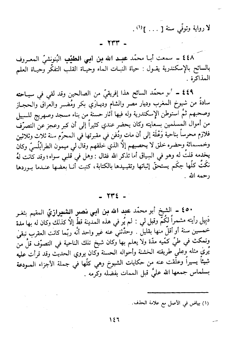 448 - سَمِعت أَبَا مُحَمَّدٍ عَبْدَ اللَّهِ بْنَ أَبِي الطَّيِّبِ الْيُنَونشِيَّ الْمَعْرُوفَ بِالسَّائِحِ بِالْإِسْكَنْدَرِيَّةِ يَقُولُ حَيَاةُ النَّبَاتِ الْمَاءُ وَحَيَاةُ الْقَلْبِ التَّفَكُّرُ وَحَيَاةُ الْعِلْمِ الْمُذَاكَرَةُ