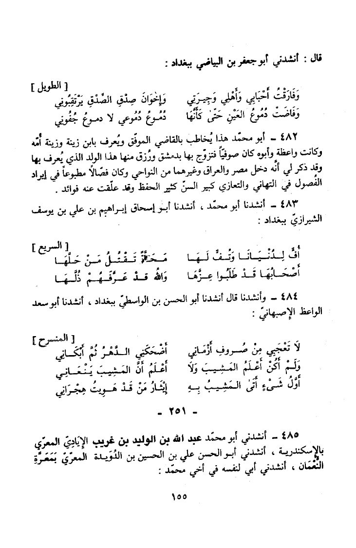 484 - وَأَنْشَدَنَا قَالَ أَنْشَدَنَا أَبُو الْحَسَنِ بْنُ الْوَاسِطِيِّ بِبَغْدَادَ أَنْشَدَنَا أَبُو سَعْدٍ الْوَاعِظُ الْأصْبَهَانِيُّ