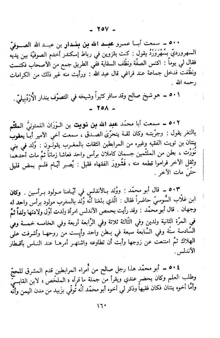 504 - أَبُو مُحَمَّدٍ هَذَا رَجُلٌ صَالِحٌ مِنْ أُمَرَاءِ الْمُرَابِطِينَ قَدِمَ الْمَشْرِقَ لِلْحَجِّ وَطَلَبِ الْعِلْمِ وَكَانَ يَحْضُرُ عِنْدِي وَيَقْرَأُ مِنْ جُمْلَةِ مَا قَرَأَهُ الْمُلَخَّصَ لِابْنِ الْقَابِسِيِّ وَأَمَّا أَخُوهُ يَنْتَانُ فَكَانَ فَقِيهًا وَذَكَرَ لِي أَخُوهُ أَبُو مُحَمَّدٍ أَنَّهُ تُوُفِّيَ بِزَبِيدَ مِنْ مُدُنِ الْيَمَنِ وَأَنَّهُ