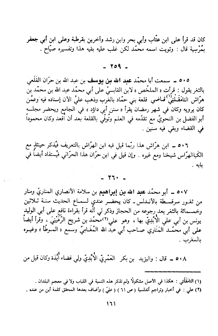 505 - سَمِعت أَبَا مُحَمَّدٍ عَبْدَ اللَّهِ بْنَ يُوسُفَ بْنِ عَبْدِ اللَّهِ بْنِ حَرَّانَ الْقَلَعِيَّ بِالثَّغْرِ يَقُولُ قَرَأْتُ الْمُلَخَّصَ لِابْنِ الْقَابِسِيِّ عَلَى أَبِي مُحَمَّدٍ عَبْدُ اللَّهِ بْنُ مُحَمَّدِ بْنِ هَرَّاشٍ التَّامَقَلْتِيِّ قَاضِي قَلْعَةِ بَنِي حَمَّادٍ بِالْغَرْبِ وَذَهَبَ عَلِيَّ الْآنَ إِسْنَادُهُ فِيهِ وَعَمَّنْ كَانَ يَرْوِيهِ وَكَانَ فِي شَهْرِ رَمَضَانَ يَقْرَأُ سُنَنَ أَبِي دَاؤُدَ فِي الْجَامِعِ وَيَحْضُرُ مَجْلِسَهُ أَبُو الْفَضْلِ بْنُ النَّحْوِيِّ مَعَ تَقَدُّمِهِ فِي الْعِلْمِ وَتُوُفِّيَ بِالْقَلْعَةِ بَعْدَ أَنْ أُقْعِدَ وَكَانَ مَحْمُودًا فِي الْقَضَاءِ وَبَقِيَ فِيهِ سِنِينَ