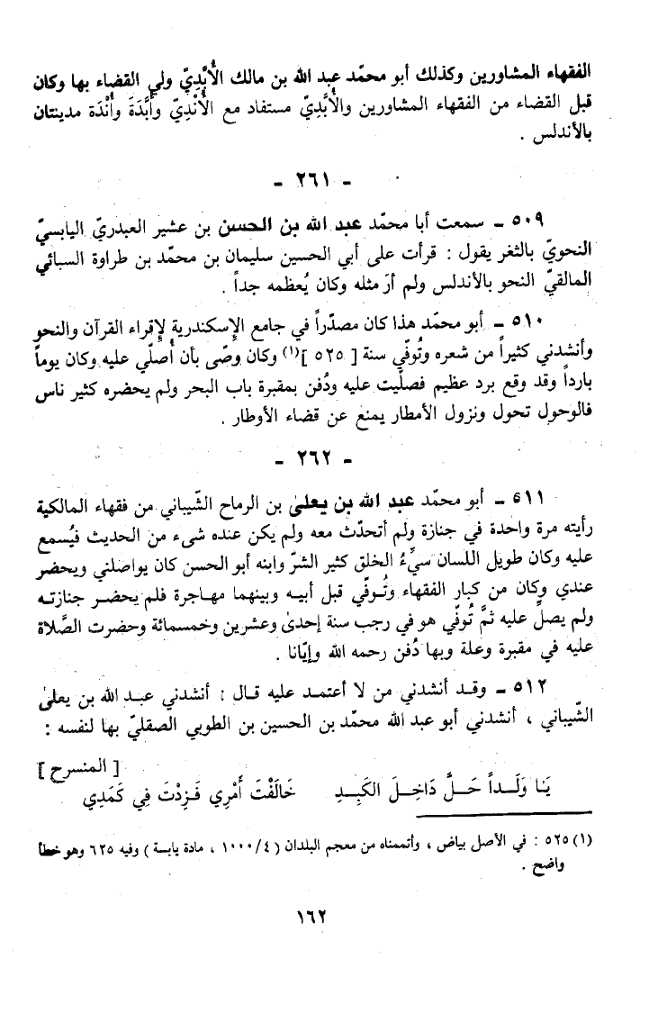 510 - أَبُو مُحَمَّدٍ هَذَا كَانَ مُصَدَّرًا فِي جَامِعِ الْإِسْكَنْدَرِيَّةِ لِإِقْرَاءِ الْقُرْآنِ وَالنَّحْوِ وَأَنْشَدَنِي كَثِيرًا مِنْ شِعْرِهِ وَتُوُفِّيَ سَنَةَ 525 وَكَانَ وَصَّى بِأَنْ أُصَلِّيَ عَلَيْهِ وَكَانَ يَوْمًا بَارِدًا وَقَدْ وَقَعَ بَرْدٌ عَظِيمٌ فَصَلَّيْتُ عَلَيْهِ وَدُفِنَ بِمَقْبَرَةِ بَابِ الْبَحْرِ وَلَمْ يَحْضُرْهُ كَثِيرُ نَاسٍ فَالْوُحُولُ تَحُولُ وَنُزُولُ الْأَمْطَارِ يَمْنَعُ عَنْ قَضَاءِ الْأَوْطَارِ