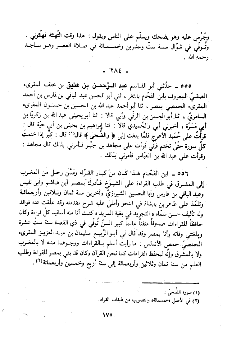 556 - ابْنُ الْفَحَّامِ هَذَا كَانَ مِنْ كِبَارِ الْقُرَّاءِ وَمِمَّنْ رَحَلَ مِنَ الْمَغْرِبِ إِلَى الْمَشْرِقِ فِي طَلَبِ الْقِرَاءَةِ عَلَى الشُّيُوخِ فَأَدْرَكَ بِمِصْرَ ابْنَ هَاشِمٍ وَابْنَ نَفِيسٍ وَعَبْدَ الْبَاقِي بْنَ فَارِسٍ وَأَبَا الْحُسَيْنِ الشِّيرَازِيَّ وَآخَرِينَ سَنَةَ ثَمَان وَثَلَاثِينَ وَأَرْبَعمِائَة وَتَلَمَّذَ عَلَى طَاهِرِ بْنِ بَابَشَاذَ فِي النَّحْوِ وَأَمْلَى عَلَيْهِ شَرْحَ مُقَدِّمَتِهِ وَقَدْ عَلَّقْتُ عَنْهُ فَوَائِدَ وَلَهُ تَأْلِيفٌ حَسَنٌ سَمَّاهُ التَّجْرِيدَ فِي بُغْيَةِ الْمُرِيدِ كَتَبْتُ أَنَا مِنْهُ أَسَانِيدَ كُلِّ قِرَاءَةٍ وَكَانَ حَافِظًا لِلْقِرَاءَاتِ صَدُوقًا مُتْقِنًا عَالِمًا كَبِيرَ السِّنِّ تُوُفِّيَ فِي ذِي الْقَعْدَةِ سَنَةَ سِتَّ عَشْرَةَ وَبَلَغَتْنِي وَفَاتُهُ وَأَنَا بِمِصْرَ وَقَدْ قَالَ لِي أَبُو الرَّبِيعِ سُلَيْمَانُ بْنُ عَبْدِ الْعَزِيزِ الْمُقْرِئُ الْحِمْصِيُّ حِمْصُ الْأَنْدَلُسِ مَا رَأَيْتُ أَعْلَمَ بِالْقِرَاءَاتِ وَوُجُوهِما مِنْهُ لَا بِالْمَغْرِبِ وَلَا بِالْمَشْرِقِ وَإِنَّهُ لَيَحْفَظُ الْقِرَاءَاتِ كَمَا نَحن الْقُرْآنَ وَكَانَ قَدْ بَقِيَ بِمِصْرَ لِلْقِرَاءَةِ وَطَلَبِ الْعِلْمِ مِنْ سَنَةِ ثَمَان وَثَلَاثِينَ وَأَرْبَعمِائَة إِلَى سنة ارْبَعْ وَخمسين وَأَرْبَعمِائَة