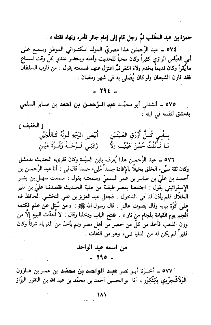 576 - عَبْدُ الرَّحْمَنِ هَذَا يُعْرَفُ بِابْنِ السَّيِّدَةِ وَكَانَ قَارِئَ الْحَدِيثِ بِدِمَشْقَ وَكَانَ ثِقَة سيىء الْخُلُقِ بَخِيلًا بِالْإِفَادَةِ جَسَدًا مُلِئَ حَسَدًا قَالَ لِي أَنَا عَبْدُ الرَّحْمَنِ بْنُ أَحْمَدَ بْنِ عَلِيِّ بْنِ صَابِرِ بْنِ عُمَرَ السَّلْمِيُّ وَسَمِعْتُهُ يَقُولُ سَمِعْتُ سَهْلَ بْنَ بشر الإسفرائيني يَقُولُ اجْتَمَعْنَا بِمِصْرَ طَبَقَةً مِنْ طَلَبَةِ الْحَدِيثِ فَقَصَدْنَا عَلِيَّ بْنَ مُنِيرٍ الْخَلَّالَ فَلَمْ يَأْذَنْ لَنَا فِي الدُّخُولِ
