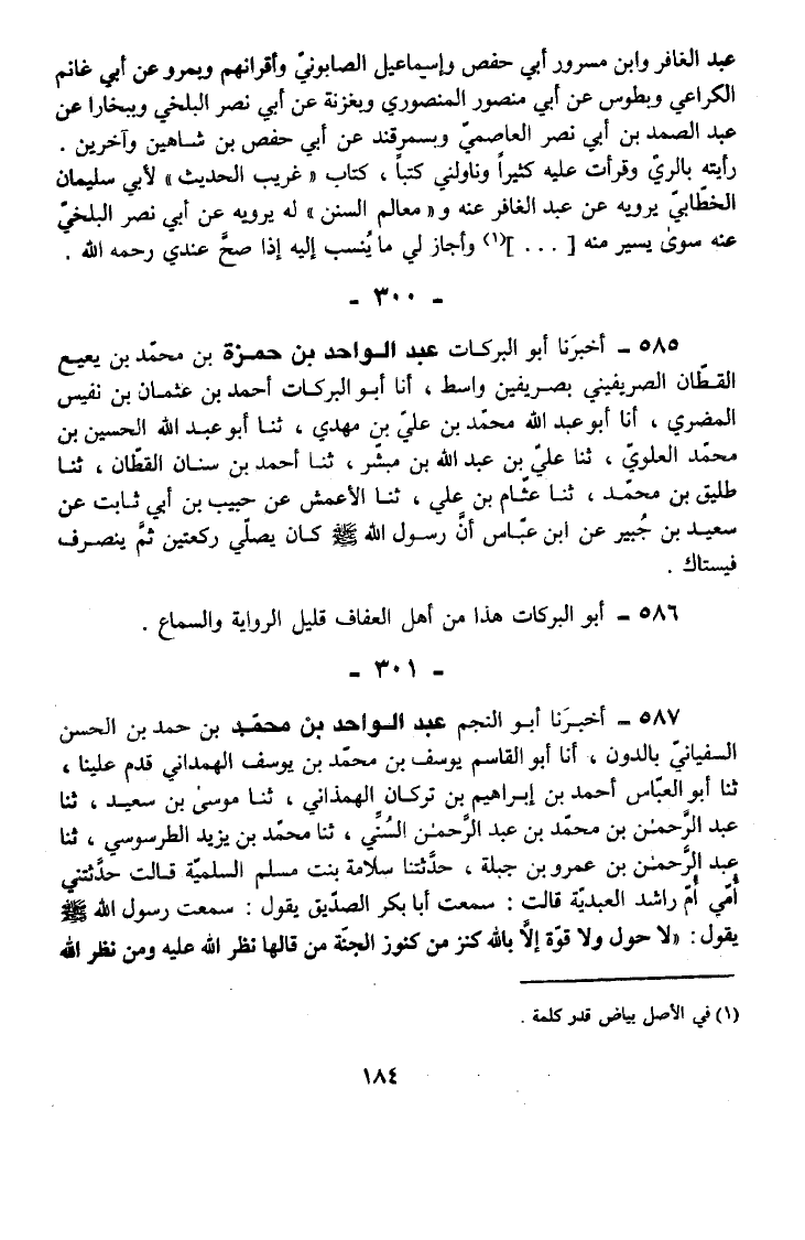 587 - أَخْبَرَنَا أَبُو النَّجْمِ عَبْدُ الْوَاحِدِ بْنُ مُحَمَّدِ بْنِ حَمْدِ بْنِ الْحَسَنِ السُّفْيَانِيُّ بِالدُّونِ أَنَا أَبُو الْقَاسِمِ يُوسُفُ بْنُ مُحَمَّدِ بْنِ يُوسُفَ الْهَمْدَانِيُّ قَدِمَ عَلَيْنَا ثَنَا أَبُو الْعَبَّاسِ أَحْمَدُ بْنُ إِبْرَاهِيمَ بْنِ تُرْكَانَ الْهَمَذَانِيُّ ثَنَا مُوسَى بْنُ سَعِيدٍ ثَنَا عَبْدُ الرَّحْمَنِ بْنِ مُحَمَّدِ بْنِ عَبْدِ الرَّحْمَنِ السُّنِّيُّ ثَنَا مُحَمَّدُ بْنُ يَزِيدَ الطَّرَسُوسِيُّ ثَنَا عَبْدُ الرَّحْمَنِ بْنُ عَمْرِو بْنِ جَبَلَةَ حَدَّثَتْنَا سَلَّامَةُ بِنْتُ مُسْلِمٍ السُّلَمِيَّةُ قَالَتْ حَدَّثَتْنِي أُمِّي أُمُّ رَاشِدٍ الْعَبْدِيَّةُ قَالَتْ سَمِعْتُ أَبَا بَكْرٍ الصِّدِّيقَ يَقُولُ سَمِعْتُ رَسُولَ اللَّهِ صَلَّى اللَّهُ عَلَيْهِ وَسَلَّمَ يَقُولُ لَا حَوْلَ وَلَا قُوَّةَ إِلَّا بِاللَّهِ كَنْزٌ مِنْ كُنُوزِ الْجَنَّةِ مَنْ قَالَهَا نظر الله عَلَيْهِ وَمَنْ نَظَرَ اللَّهُ