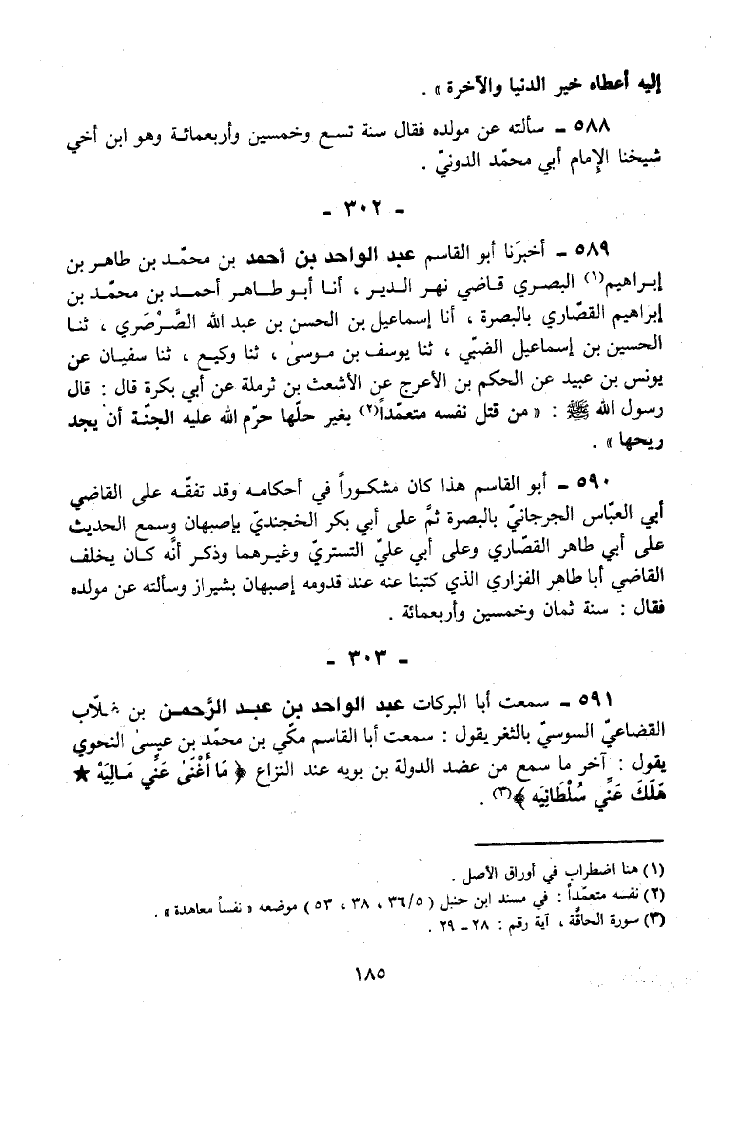 588 - سَأَلْتُهُ عَنْ مَوْلِدِهِ فَقَالَ سَنَةَ تسع وَخمسين وَأَرْبَعمِائَة وَهُوَ ابْنُ أَخِي شَيْخِنَا الْإِمَامِ أَبِي مُحَمَّدِ الدُّونِيِّ