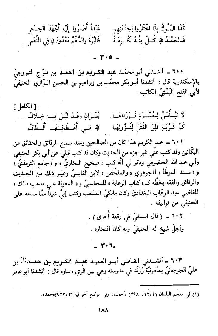 603 - أَنْشَدَنِي الْقَاضِي أَبُو الْعَمِيدِ عَبْدُ الْكَرِيمِ بْنُ حَمْدِ بْنِ عَلِيٍّ الْجُرْجَانِيُّ بِمَأْمُونِيَّةِ زَرَنْدَ فِي مَدْرَسَتِهِ وَهِيَ بَيْنَ الرَّيِّ وَسَاوَةَ قَالَ أَنْشَدَنَا أَبُو عَامِرٍ
