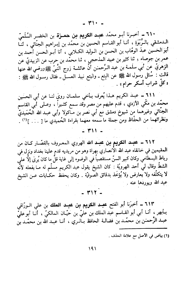 611 - عَبْدُ الْكَرِيمِ هَذَا يُعْرَفُ بِأَخِي سَلْمَانَ رَوَى لَنَا عَنْ أَبِي الْحُسَيْنِ مُحَمَّدِ بْنِ مَكِّيٍّ الْأَزْدِيِّ قَدِمَ عَلَيْهِمْ مِنْ مِصْرَ وَقَدْ سَمِعَ كَثِيرًا وَعَلَى أَبِي الْقَاسِمِ الْحِنَّائِيِّ وَغَيْرِهِمَا مِنْ شُيُوخِ دِمَشْقَ مَعَ أَبِي نصر بن مَاكُولَا وَأَبِي عَبْدِ اللَّهِ الْحُمَيْدِيِّ وَنُظَرَائِهِمَا مِنَ الْحُفَّاظِ وَمِنْ جُمْلَةِ مَا سَمِعَهُ مَعَهُمَا بِقِرَاءَةِ الْحُمَيْدِيِّ مَا
