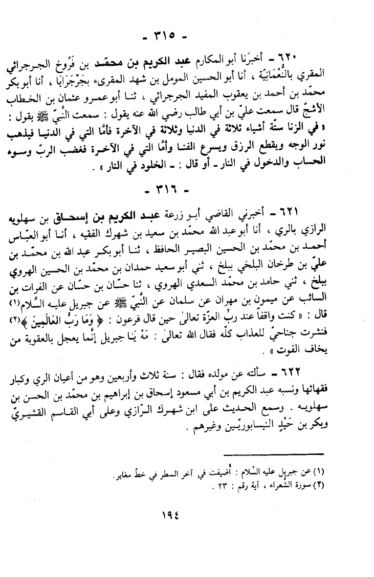 622 - سَأَلْتُهُ عَنْ مَوْلِدِهِ فَقَالَ سَنَةَ ثَلَاثٍ وَأَرْبَعِينَ وَهُوَ مِنْ أَعْيَانِ الرَّيِّ وَكِبَارِ فُقَهَائِهَا وَنَسَبُهُ عَبْدُ الْكَرِيمِ بْنُ أَبِي مَسْعُودٍ إِسْحَاقَ بْنِ إِبْرَاهِيمَ بْنِ مُحَمَّدِ بْنِ الْحَسَنِ بْنِ سَهْلَوَيْهِ