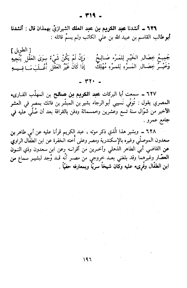 628 - وَبَشِيرٌ هَذَا الَّذِي ذَكَرَ مَوْتَهُ عَبْدُ الْكَرِيمِ قَرَأْنَا عَلَيْهِ عَنْ أَبِي طَاهِرِ بْنِ سَعْدُونَ الْمَوْصِلِيِّ وَغَيْرِهِ بِالْإِسْكَنْدَرِيَّةِ وَمِصْرَ وَعَلَى أُخْتِهِ الْخَفِرَةِ عَنِ ابْنِ الطَّفَّالِ الرَّاوِي عَنِ الْقَاضِي أَبِي الطَّاهِرِ الذُّهْلِيِّ وَآخَرِينَ مِنْ أَقْرَانِهِ وَعَنِ ابْنِ سَعْدُونَ وَذِي النُّونِ الْعَصَّارِ وَغَيْرِهِمَا وَقَدْ بَلَغَنِي بَعْدَ خُرُوجِي مِنْ مِصْرَ أَنَّهُ قَدْ وُجِدَ لِبَشِيرٍ سَمَاعٌ مِنَ ابْنِ الطَّفَّالِ وَقُرِئَ عَلَيْهِ وَكَانَ شَيْخًا سَرِيًّا وَبِمَعَارِفِهِ حَفِيًّا