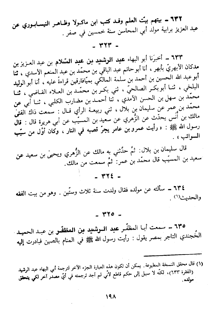 632 - بَيْتُهُمْ بَيْتُ الْعِلْمِ وَقَدْ كَتَبَ ابْنُ مَاكُولَا وَظَاهِرٌ النَّيْسَابُورِيُّ عَنْ عَبْدِ الْعَزِيزِ بِرَابِيَةَ مَوْلِدُ أَبِي الْمَحَاسِنِ سَنَةَ خَمْسِينَ فِي صَفَرٍ