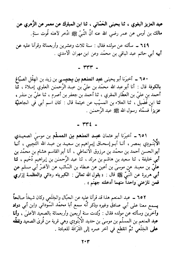 652 - عَبْدُ الْمُنْعِمِ هَذَا قَدْ قَرَأْنَا عَلَيْهِ عَنِ الْحَبَّالِ وَالْخِلَعِيِّ وَكَانَ شَيْخًا صَالِحًا يَسْمَعُ مَعَنَا عَلَى أَبِي صَادَقٍ وَغَيْرِهِ وَذَكَرَ أَنَّهُ سَمِعَ أَبَا مُحَمَّد السوداني وَابْن أبي دواد وَآخَرِينَ وَسَأَلْتُهُ عَنْ مَوْلِدِهِ فَقَالَ ولدت سنة أَرْبَعِينَ وَأَرْبَعمِائَة الصَّعِيد الْأَعْلَى وَأَنَا عَبْدُ الْمُنْعِمِ بْنُ الْمُسْلِمِ بْنِ مُوسَى بْنِ حَدِيدٍ الْأَبْنُودِيُّ وَهِيَ قَرْيَةٌ مِنْ قُرَى بالصعيد وَتَفَقَّهَ عَلَى الْخِلَعِيِّ ثُمَّ انْقَطَعَ فِي آخِرِ عُمْرِهِ إِلَى الْقَرَافَةِ لِلْعِبَادَةِ