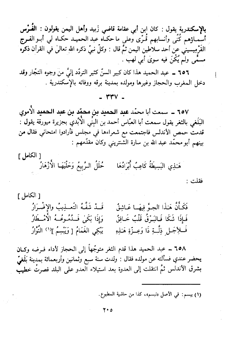 658 - عَبْدُ الْحَمِيدِ هَذَا قَدِمَ الثَّغْرَ مُتَوَجِّهًا إِلَى الْحِجَازِ لِأَدَاءِ فَرْضِهِ وَكَانَ يَحْضُرُ عِنْدِي فَسَأَلْتُهُ عَنْ مَوْلِدِهِ فَقَالَ وُلِدْتُ سَنَةَ سَبْعٍ وَثَمَانِينَ وَأَرْبَعمِائَة بِمَدِينَةِ بَلَغِيَّ بِشَرْقِ الْأَنْدَلُسِ ثُمَّ انْتَقَلْتُ إِلَى الْعُدْوَةِ بَعْدَ اسْتِيلَاءِ الْعَدُوِّ عَلَى الْبَلَدِ فَصِرْتُ خَطِيبَ