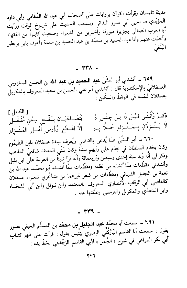 661 - سَمِعت أَبَا مُحَمَّدٍ عَبْدَ الْجَلِيلِ بْنَ مُحَمَّدِ بْنِ الْمُسْلِمِ الْحَيْفِيَّ بِصُورَ يَقُولُ سَمِعت أَبَا الْقَاسِمِ الْبَازْكُلِّيَّ الْبَصْرِيَّ بِتِنِّيسَ يَقُولُ قَرَأْتُ عَلَى ظَهْرِ كِتَابِ أَبِي بَكْرٍ الْمَرَاغِيِّ فِي شَرْحِ الْجُمَلِ لِأَبِي الْقَاسِمِ الزَّجَّاجِيِّ بِخَطِّ يَدِهِ
