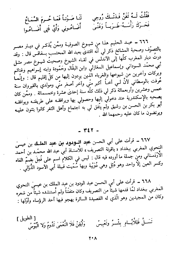 668 - قَرَأْتُ عَلَى أَبِي الْحَسَنِ عَبْدِ الْوَدُودِ بْنِ عَبْدِ الْمَلِكِ بْنِ عِيسَى النَّحْوِيِّ الْمَغْرِبِيِّ بِبَغْدَادَ لَمَّا قَدِمَهَا شَيْئًا مِنَ التَّصْرِيفِ وَكَانَ مُتَفَنِّنًا وَلَمْ أَسْتَنْشِدْهُ شَيْئًا مِنْ شِعْرِهِ وَكَانَ مِنَ الْمُجِيدِينَ وَهُوَ الَّذِي لَهُ الْقَصِيدَةُ السَّائِرَةُ يَهْجُو فِيهَا أَحَدَ الرُّؤَسَاءِ وَأَوَّلُهَا