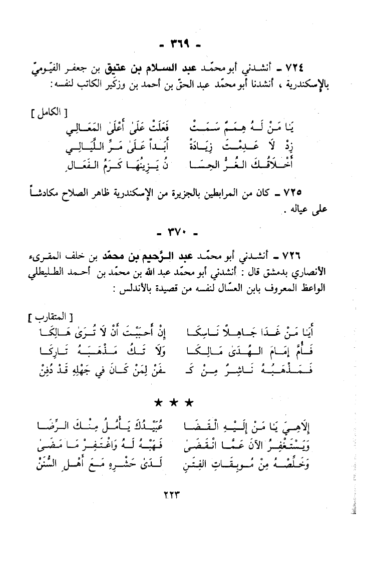 724 - أَنْشَدَنِي أَبُو مُحَمَّدٍ عَبْدُ السَّلَامِ بْنُ عَتِيقِ بْنِ جَعْفَرٍ الْفَيُّومِيُّ بِالْإِسْكَنْدَرِيَّةِ أَنْشَدَنَا أَبُو مُحَمَّدٍ عَبْدُ الْحَقِّ بْنُ أَحْمَدَ بْنِ وَزَكِيرَ الْكَاتِبُ لِنَفْسِهِ