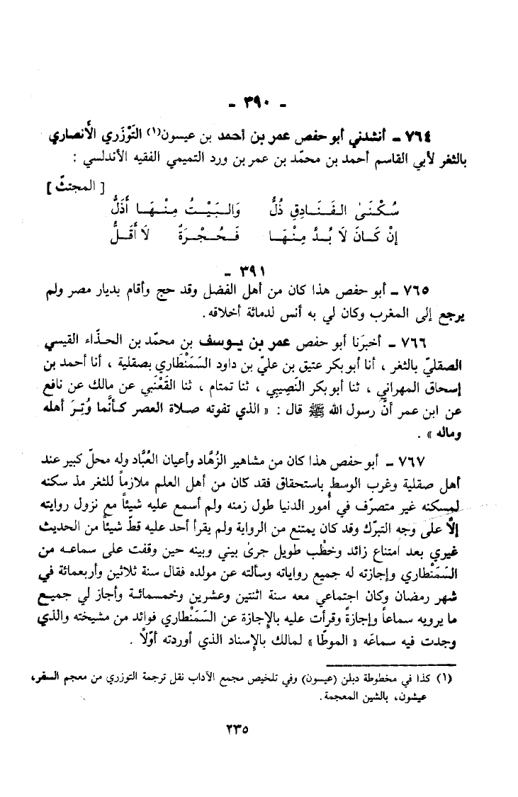 767 - أَبُو حَفْصٍ هَذَا كَانَ مِنْ مَشَاهِيرِ الزُّهَّادِ وَأَعْيَانِ الْعُبَّادِ وَلَهُ مَحِلٌّ كَبِيرٌ عِنْدَ أَهْلِ صَقَلِّيَةَ وَغَرْبِ الْوَسَطِ بِاسْتِحْقَاقٍ فَقَدْ كَانَ مِنْ أَهْلِ الْعِلْمِ مُلَازِمًا لِلثَّغْرِ مُذْ سَكَنَهُ لِمَسْكَنِهِ غَيْرَ مُتَصَرِّفٍ فِي أُمُورِ الدُّنْيَا طُولَ زَمَنِهِ وَلَمْ أَسْمَعْ عَلَيْهِ شَيْئًا مَعَ نُزُولِ رِوَايَتِهِ إِلَّا عَلَى وَجْهِ التَّبَرُّكِ وَقَدْ كَانَ يَمْتَنِعُ مِنَ الرِّوَايَةِ وَلَمْ يَقْرَأْ أَحَدٌ عَلَيْهِ قَطُّ شَيْئًا مِنَ الْحَدِيثِ غَيْرِي بَعْدَ امْتِنَاعٍ زَائِدٍ وَخَطْبٍ طَوِيلٍ جَرَى بَيْنِي وَبَيْنَهُ حِينَ وَقَفْتُ عَلَى سَمَاعِهِ مِنَ السَّمَنْطَارِيِّ وَإِجَازَتِهِ لَهُ جَمِيعَ رِوَايَاتِهِ وَسَأَلْتُهُ عَنْ مَوْلِدِهِ فَقَالَ سَنَةَ ثَلَاثِينَ وَأَرْبَعمِائَة فِي شَهْرِ رَمَضَانَ وَكَانَ اجْتِمَاعِي مَعَه سنة اثْنَتَيْنِ وَعشْرين وَخَمْسمِائة وَأَجَازَ لِي جَمِيعَ مَا يَرْوِيهِ سَمَاعًا وَإِجَازَةً وَقَرَأْتُ عَلَيْهِ بِالْإِجَازَةِ عَنِ السَّمَنْطَارِيِّ فَوَائِدَ مِنْ مَشْيَخَتِهِ وَالَّذِي وَجَدْتُ فِيهِ سَمَاعَهُ الْمُوَطَّأَ لِمَالِكٍ بِالْإِسْنَادِ الَّذِي أَوْرَدْتُهُ أَوَّلًا