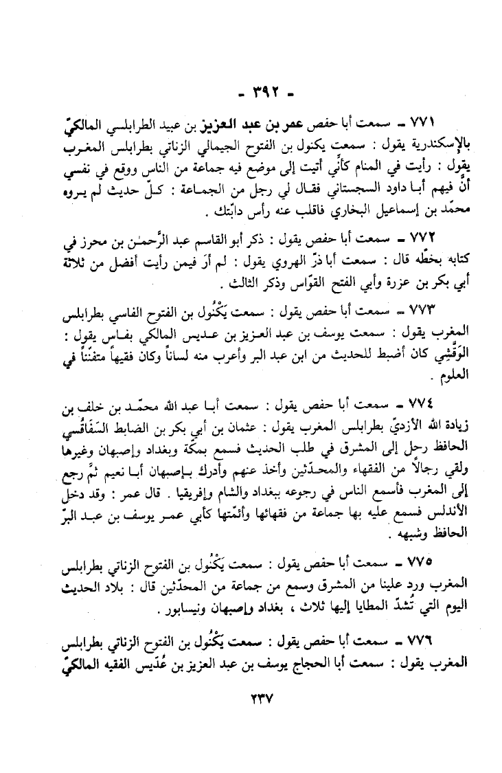 775 - سَمِعت أَبَا حَفْصٍ يَقُولُ سَمِعت يَكْنُولَ بْنَ الْفُتُوحِ الزَّنَاتِيَّ بِطَرَابُلُسِ الْمَغْرِبِ وَرَدَ عَلَيْنَا مِنَ الْمَشْرِقِ وَسَمِعَ مِنْ جَمَاعَةٍ مِنَ الْمُحَدِّثِينَ قَالَ بِلَادُ الْحَدِيثِ الْيَوْمَ الَّتِي تُشَدُّ الْمَطَايَا إِلَيْهَا ثَلَاثٌ بَغْدَادُ وَأصْبَهَانُ وَنَيْسَابُورُ