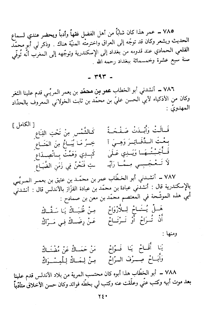 786 - أَنْشَدَنِي أَبُو الْخَطَّابِ عُمَرُ بْنُ مُحَمَّدِ بْنِ يَعْمُرَ الْمَرِيِّيُّ قَدِمَ عَلَيْنَا الثَّغْرَ وَكَانَ مِنَ الْأَذْكِيَاءِ لِأَبِي الْحَسَنِ عَلَيِّ بْنِ مُحَمَّدِ بْنِ ثَابِتٍ الْخَوْلَانِيِّ الْمَعْرُوفِ بِالْحَدَّادِ الْمَهْدَوِيِّ