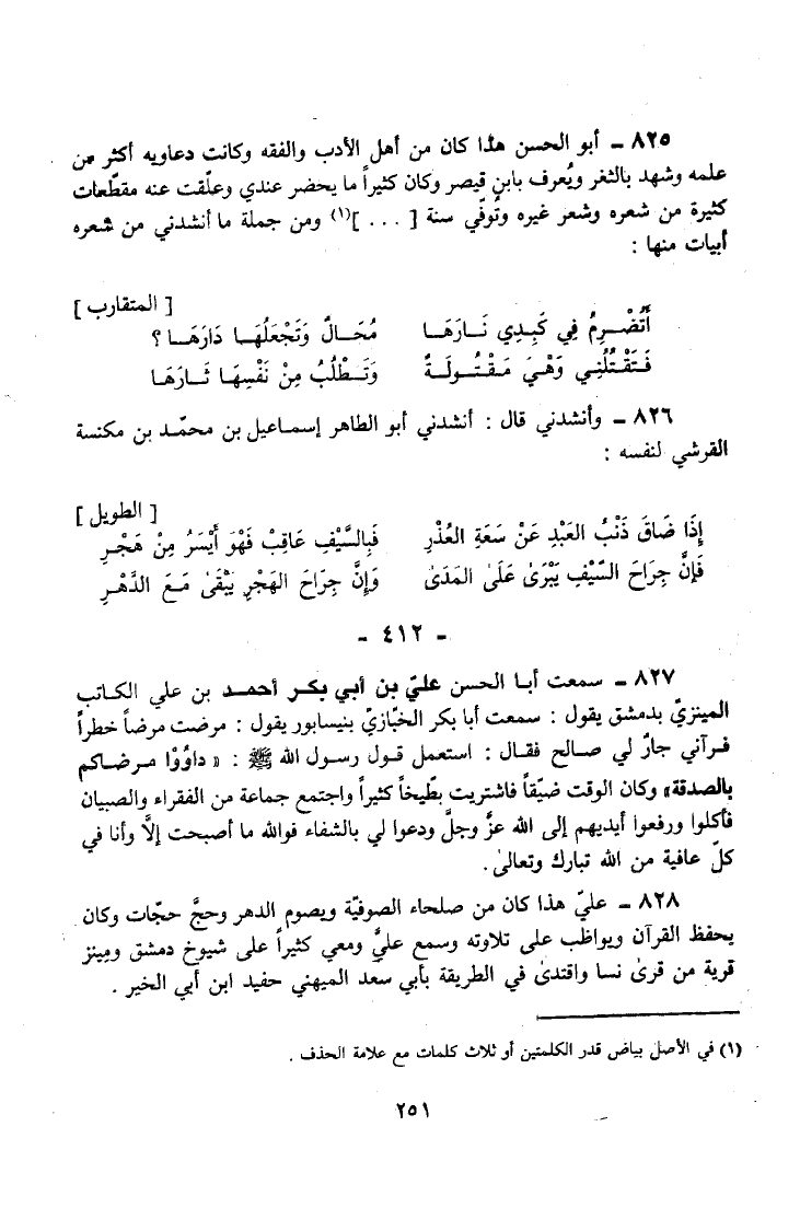 828 - عَلِيٌّ هَذَا كَانَ مِنْ صُلَحَاءِ الصُّوفِيَّةِ وَيَصُومُ الدَّهْرَ وَحَجَّ حَجَّاتٍ وَكَانَ يَحْفَظُ الْقُرْآنَ وَيُوَاظِبُ عَلَى تِلَاوَتِهِ وَسَمِعَ عَلَيَّ وَمَعِي كَثِيرًا عَلَى شُيُوخِ دِمَشْقَ وَمِينَزُ قَرْيَةٌ مِنْ قُرَى نَسَا وَاقْتَدَى فِي الطَّرِيقَةِ بِأَبِي سَعْدٍ الْمِيهَنِيِّ حَفِيدِ ابْنِ أَبِي الْخَيْرِ.
