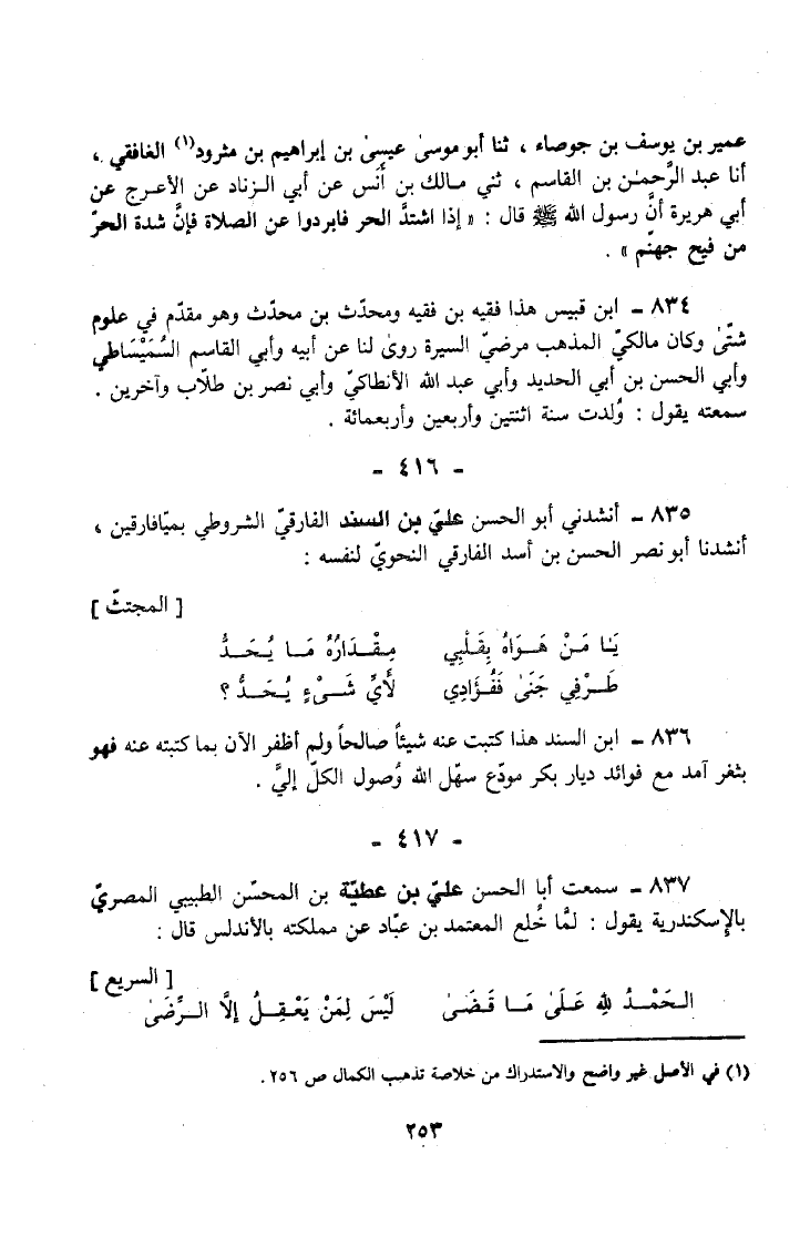 835 - أَنْشَدَنِي أَبُو الْحَسَنِ عَلِيُّ بْنُ السَّنَدِ الْفَارِقِيُّ الشُّرُوطِيُّ بِمَيَّافَارِقِينَ أَنْشَدَنَا أَبُو نَصْرٍ الْحَسَنُ بْنُ أَسَدٍ الْفَارِقِيُّ النَّحْوِيُّ لِنَفْسِهِ