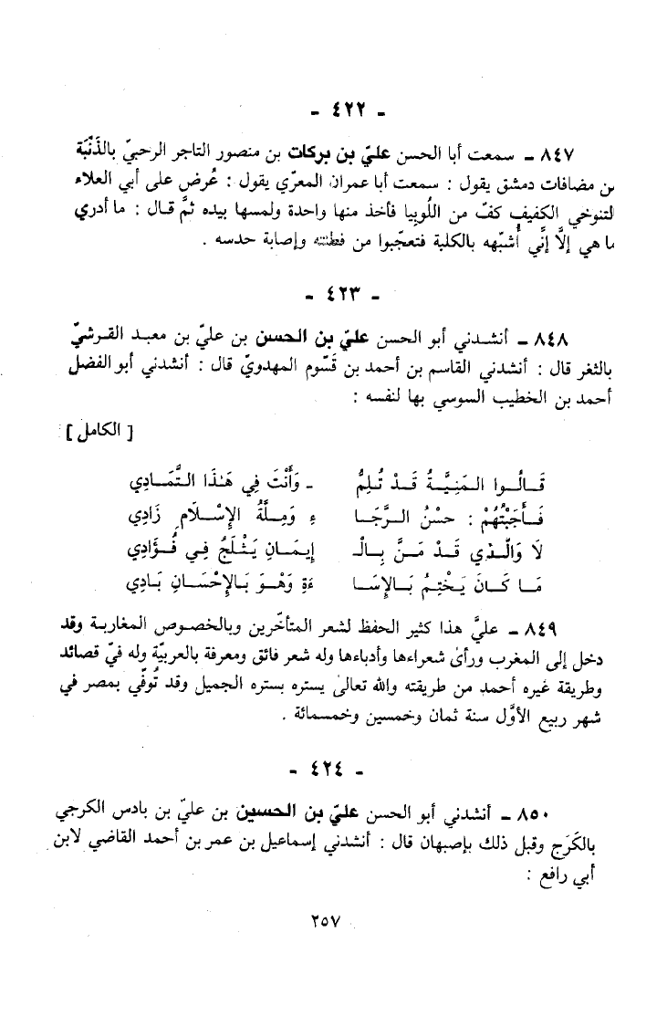 850 - أَنْشَدَنِي أَبُو الْحَسَنِ عَلِيُّ بْنُ الْحُسَيْنِ بْنِ عَلِيِّ بْنِ بَادِسَ الْكَرَجِيُّ بِالْكَرَجِ وَقَبْلَ ذَلِكَ بِأصْبَهَانَ قَالَ أَنْشَدَنِي إِسْمَاعِيلُ بْنُ عُمَرَ بْنِ أَحْمَدَ الْقَاضِي لِابْنِ أَبِي رَافِعٍ