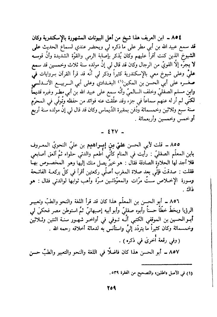 854 - ابْنُ الْعَرِيفِ هَذَا شَيْخٌ مِنْ أَهْلِ الْبُيُوتَاتِ الْمَشْهُورَةِ بِالْإِسْكَنْدَرِيَّةِ وَكَانَ قَدْ سَمِعَ عُبَيْدَ اللَّهِ بْنَ أَبِي مَطَرٍ عَلَى مَا ذَكَرَهُ لِي وَيَحْضُرُ عِنْدِي لِسَمَاعِ الْحَدِيثِ عَلَى الشُّيُوخِ الَّذِينَ كُنْتُ أَقْرَأُ عَلَيْهِمْ وَكَانَ يُذْكَرُ بِإِصَابَةِ الرَّمْيِ وَالْقُوَّةِ الشَّدِيدَةِ وَأَنَّ قَوْسَهُ لَا يَجُرُّهُ إِلَّا الْقَوِيُّ مِنَ الرِّجَالِ وَكَانَ قَدْ قَالَ لِي إِنَّ مَوْلِدَهُ سَنَةَ ثَلَاثٍ وَخَمْسِينَ قَدْ سَمِعَ عَلَيَّ وَعَلَى شُيُوخٍ مَعِي بِالْإِسْكَنْدَرِيَّةِ كَثِيرًا وَذَكَرَ لِي أَنَّهُ قَدْ قَرَأَ الْقُرْآنَ بِرِوَايَاتٍ فِي صِغَرِهِ عَلَى أَبِي الْحَسَنِ بْنِ الْمَكِينِ الْبَغْدَادِيِّ وَعَلَى أَبِي الرَّبِيعِ الْأَنْدَلُسِيِّ وَابْنِ مُسْلِمٍ الصَّقَلِّيِّ وَخَلَفٍ السَّالِمِيِّ وَأَنَّهُ سَمِعَ عَلَى عُبَيْدِ اللَّهِ بْنِ أَبِي مَطَرٍ وَغَيْرِهِ قَدِيمًا لَكِنِّي لَمْ أَرَ لَهُ عَنْهُمْ سَمَاعًا فِي جُزْءٍ وَقَدْ عَلَّقْتُ عَنْهُ فَوَائِدَ مِنْ حِفْظِهِ وَتُوُفِّيَ فِي الْمُحَرَّمِ سَنَةَ سَبْعٍ وَثَلاثِينَ وَخَمْسِمِائَةٍ وَدُفِنَ بِمَقْبَرَةِ الدَّيْمَاسِ وَكَانَ قَدْ قَالَ لِي إِنَّ مَوْلِدَهُ سَنَةَ أَرْبَعٍ أَوْ خَمْسٍ وَخمسين وَأَرْبَعمِائَة.