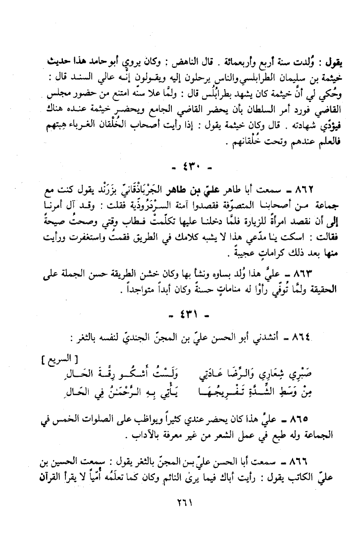 866 - سَمِعت أَبَا الْحَسَنِ عَلِيَّ بْنَ الْمِجَنِّ بِالثَّغْرِ يَقُولُ سَمِعت الْحُسَيْنَ بْنَ عَلِيٍّ الْكَاتِبَ يَقُولُ رَأَيْتُ أَبَاكَ فِيمَا يَرَى النَّائِمَ وَكَانَ كَمَا تَعْلَمُهُ أُمِّيًّا لَا يَقْرَأُ الْقُرْآنَ