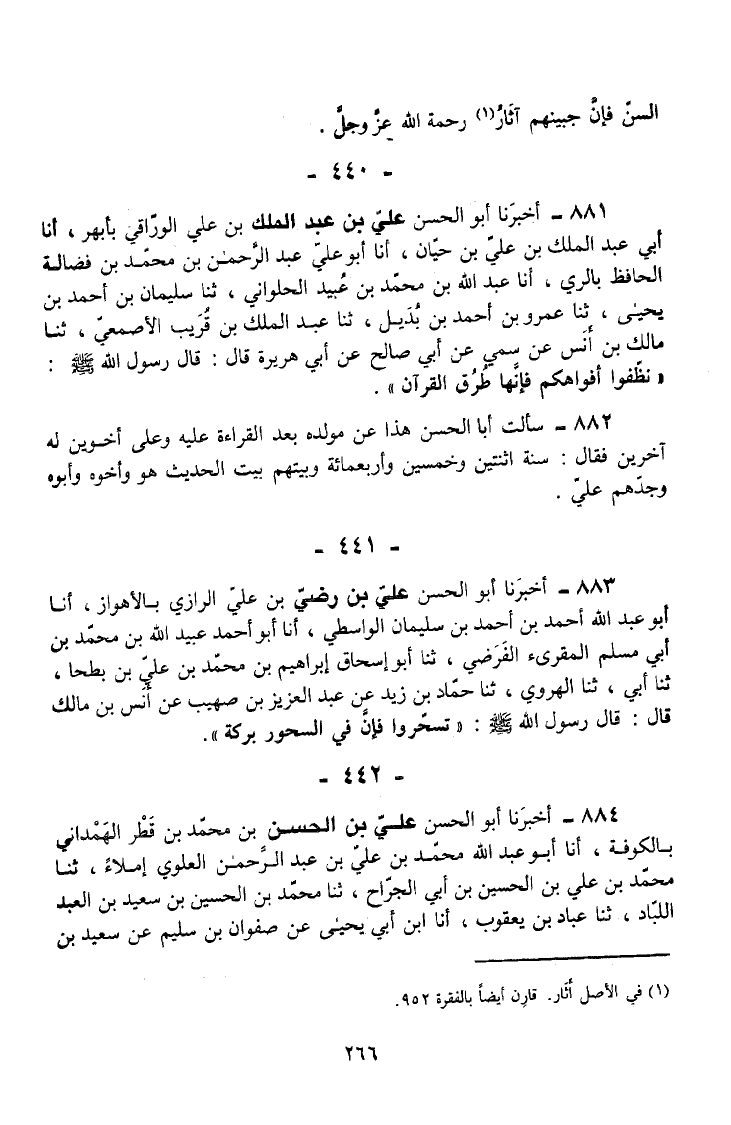 881 - أَخْبَرَنَا أَبُو الْحَسَنِ عَلِيُّ بْنُ عَبْدِ الْمَلِكِ بْنِ عَلِيٍّ الْوَرَّاقِيُّ بِأَبْهَرَ أَنَا أَبِي عَبْدُ الْمَلِكِ بْنُ عَلِيِّ بْنِ حَيَّانَ أَنَا أَبُو عَلِيٍّ عَبْدُ الرَّحْمَنِ بْنُ مُحَمَّدِ بْنِ فُضَالَةَ الْحَافِظُ بِالرَّيِّ أَنَا عَبْدُ اللَّهِ بْنُ مُحَمَّدِ بْنِ عُبَيْدٍ الْحَلْوَانِيُّ ثَنَا سُلَيْمَانُ بْنُ أَحْمَدَ بْنِ يَحْيَى ثَنَا عَمْرُو بْنُ أَحْمَدَ بْنِ بُدَيْلٍ ثَنَا عَبْدُ الْمَلِكِ بْنُ قَرِيبٍ الْأَصْمَعِيُّ ثَنَا مَالِكِ بْنِ أَنَسٍ عَنْ سُمَيٍّ عَنْ أَبِي صَالِحٍ عَنْ أَبِي هُرَيْرَةَ قَالَ قَالَ رَسُولُ اللَّهِ صَلَّى اللَّهُ عَلَيْهِ وَسَلَّمَ نَظِّفُوا أَفْوَاهَكُمْ فَإِنَّهَا طُرُقُ الْقُرْآنِ.