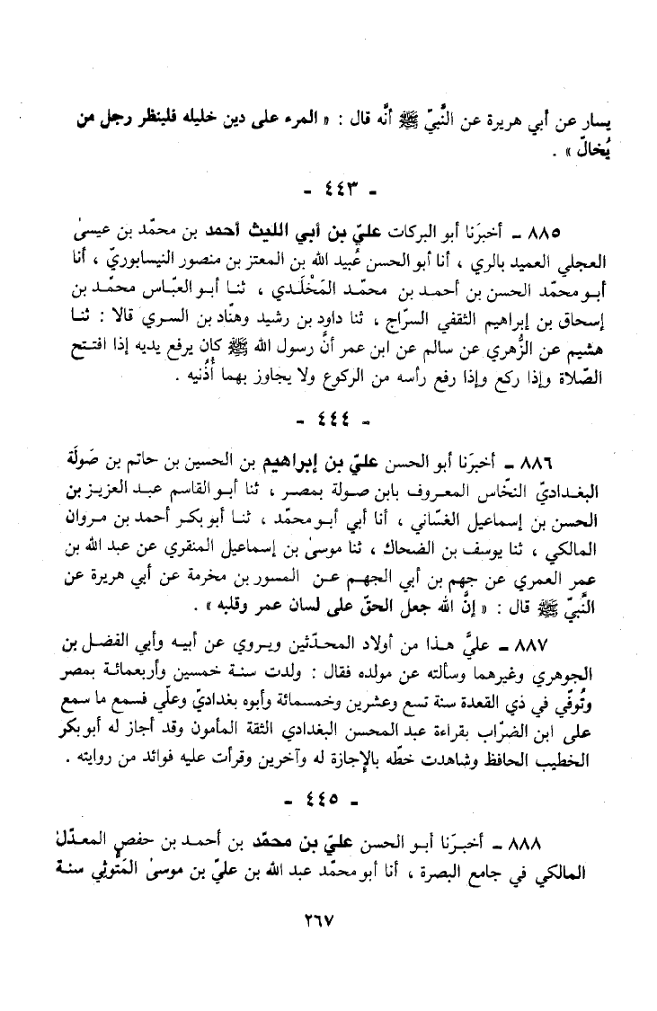 888 - أَخْبَرَنَا أَبُو الْحَسَنِ عَلِيُّ بْنُ مُحَمَّدِ بْنِ أَحْمَدَ بْنِ حَفْصٍ الْمُعَدَّلُ الْمَالِكِيُّ فِي جَامِعِ الْبَصْرَةِ أَنَا أَبُو مُحَمَّدِ عَبْدُ اللَّهِ بْنُ عَلِيِّ بْنِ مُوسَى الْمَتُّوثِيُّ سَنَةَ