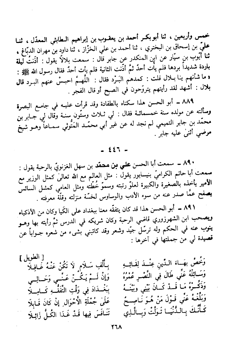 889 - أَبُو الْحَسَنِ هَذَا سُكْنَاهُ بِالطَّفَادَةِ وَقَدْ قَرَأْتُ عَلَيْهِ فِي جَامِعِ الْبَصْرَةِ وَسَأَلْتُهُ عَنْ مَوْلِدِهِ سَنَةَ خَمْسمِائَة فَقَالَ لِي ثَلَاثٌ وَسِتُّونَ سَنَةً وَقَالَ لِي جَابِرُ بْنُ مُحَمَّدِ بْنِ جَابِرٍ التَّمِيمِيُّ لَمْ نَجِدْ لَهُ عَنْ غَيْرِ أَبِي مُحَمَّدٍ الْمَتُّوثِيِّ سَمَاعًا وَهُوَ شَيْخٌ مَرْضِيٌّ أَثْنَى عَلَيْهِ جَابِرٌ