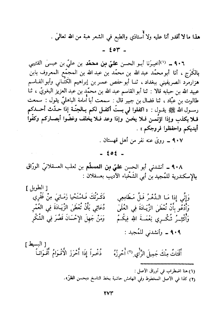 908 - أَنْشَدَنِي أَبُو الْحَسَنِ عَلِيُّ بْنُ الْمُسْلِمِ بْنِ ثَعْلَبٍ الْعَسْقَلَانِيُّ الْوَرَّاقُ بِالْإِسْكَنْدَرِيَّةِ لِلْمُجَيْدِ بْنِ أَبِي الشَّخْبَاءِ الْأَدِيبِ بِعَسْقَلَانَ