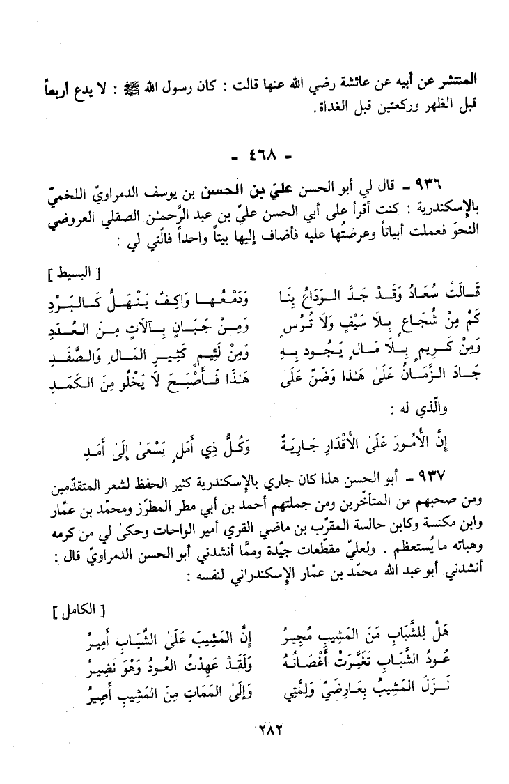 936 - قَالَ لِي أَبُو الْحَسَنِ عَلِيُّ بْنُ الْحَسَنِ بْنِ يُوسُفَ الدَّمَرَاوِيُّ اللَّخْمِيُّ بِالْإِسْكَنْدَرِيَّةِ كُنْتُ أَقْرَأُ عَلَى أَبِي الْحَسَنِ عَلِيُّ بْنُ عَبْدِ الرَّحْمَنِ الصَّقَلِّيِّ الْعَرُوضِيِّ النَّحْوَ فَعَمِلْتُ أَبْيَاتًا وَعَرَضْتُهَا عَلَيْهِ فَأَضَافَ إِلَيْهَا بَيْتًا وَاحِدًا فَالَّتِي لِي