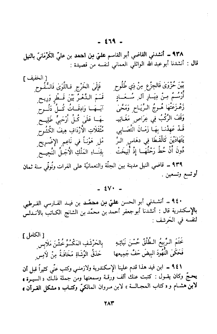 938 - أَنْشَدَنِي الْقَاضِي أَبُو الْقَاسِمِ عَلِيُّ بْنُ أَحْمَدَ بْنِ عَلِيٍّ الْكِرْمَانِيُّ بِالنِّيلِ قَالَ أَنْشَدَنَا أَبُو عَبْدِ اللَّهِ الْوَاثِلِيُّ الْعُمَانِيُّ لِنَفْسِهِ مِنْ قَصِيدَةٍ