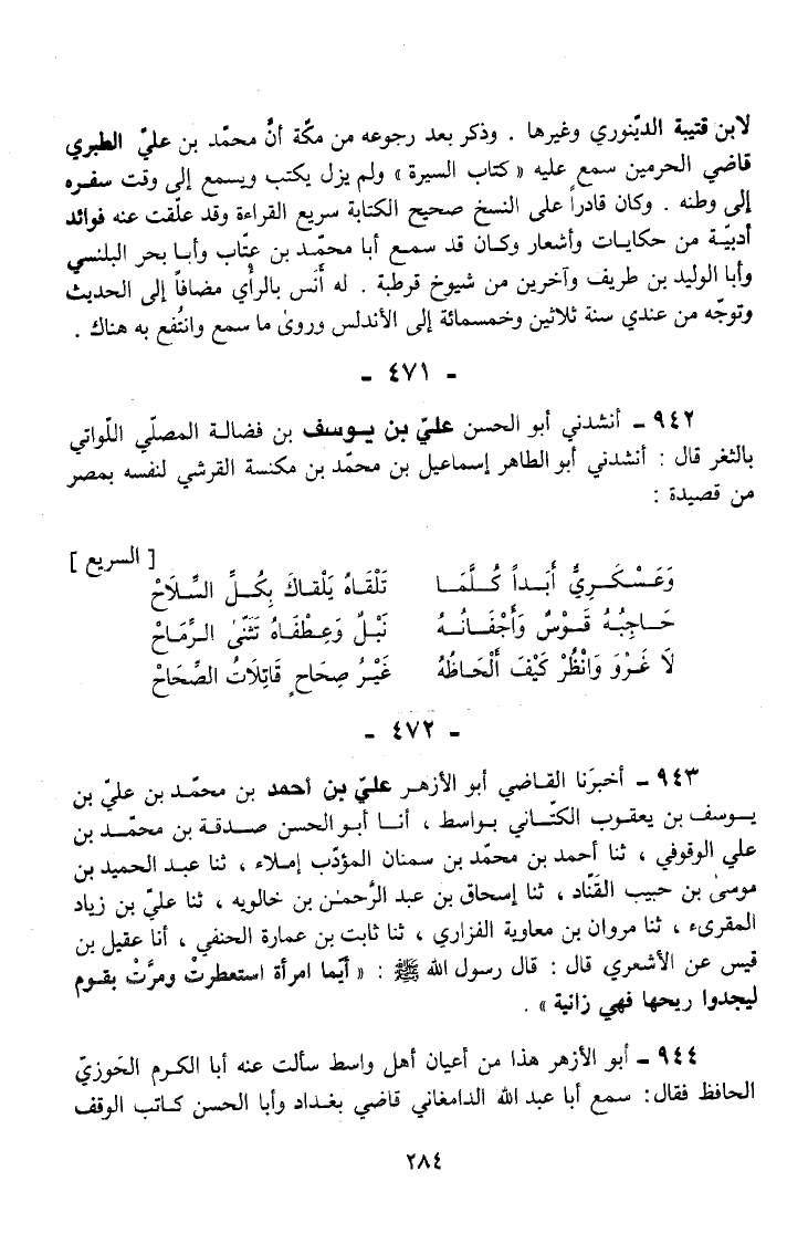 942 - أَنْشَدَنِي أَبُو الْحَسَنِ عَلِيُّ بْنُ يُوسُفَ بْنِ فُضَالَةَ الْمُصَلِّي اللَّوَاتِيُّ بِالثَّغْرِ قَالَ أَنْشَدَنِي أَبُو الطَّاهِرِ إِسْمَاعِيلُ بْنُ مُحَمَّدِ بْنِ مكْنَسَةَ الْقُرَشِيُّ لِنَفْسِهِ بِمِصْرَ مِنْ قَصِيدَةٍ
