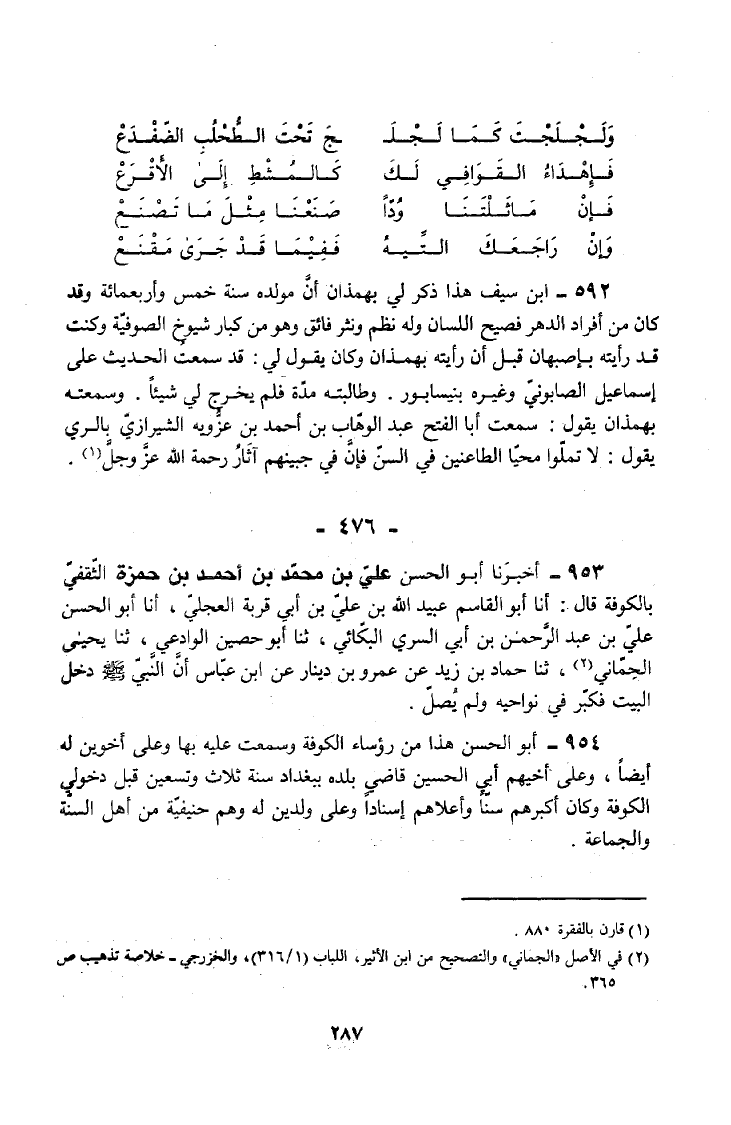 954 - أَبُو الْحَسَنِ هَذَا مِنْ رُؤَسَاءِ الْكُوفَةِ وَسمعت عَلَيْهِ بِهَا وَعَلَى أَخَوَيْنِ لَهُ أَيْضًا وَعَلَى أَخِيهِمْ أَبِي الْحُسَيْنِ قَاضِي بَلَدِهِ بِبَغْدَادَ سَنَةَ ثَلَاثٍ وَتِسْعِينَ قَبْلَ دُخُولِي الْكُوفَةَ وَكَانَ أَكْبَرَهُمْ سِنًّا وَأَعْلَاهُمْ إِسْنَادًا وَعَلَى وَلَدَيْنِ لَهُ وَهُمْ حَنِيفِيَّةٌ مِنْ أَهْلِ السُّنَّةِ وَالْجَمَاعَةِ.