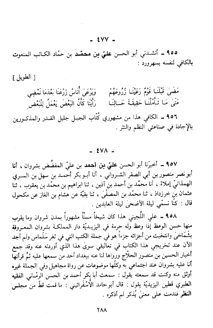 955 - أَنْشَدَنِي أَبُو الْحَسَنِ عَلِيُّ بْنُ مُحَمَّدِ بْنِ حَمَّادٍ الْكَاتِبُ الْمَنْعُوتُ بِالْكَافِي لِنَفْسِهِ بِسُهْرَوَرْدَ