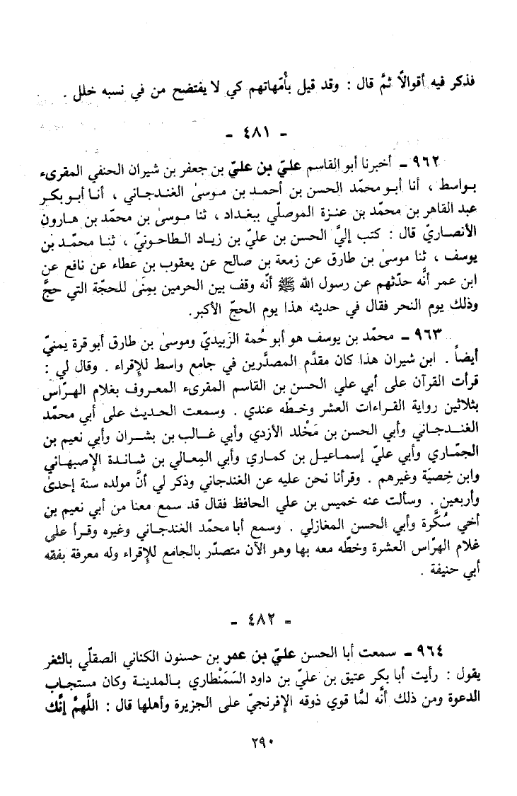 962 - أَخْبَرَنَا أَبُو الْقَاسِمِ عَلِيُّ بْنُ عَلِيِّ بْنِ جَعْفَرِ بْنِ شَيْرَانَ الْحَنَفِيُّ الْمُقْرِئُ بِوَاسِطٍ أَنَا أَبُو مُحَمَّدٍ الْحَسَنُ بْنُ أَحْمَدَ بْنِ مُوسَى الْغَنْدَجَانِيُّ أَنَا أَبُو بَكْرٍ عَبْدُ الْقَاهِرِ بْنُ مُحَمَّدِ بْنِ عَنْزَةَ الْمَوْصِلِيُّ بِبَغْدَادَ ثَنَا مُوسَى بْنُ مُحَمَّدِ بْنِ هَارُونَ الْأَنْصَارِيُّ قَالَ كَتَبَ إِلَيَّ الْحَسَنُ بْنُ عَلِيِّ بْنِ زِيَادٍ الطَّاحُونِيُّ ثَنَا مُحَمَّدُ بْنُ يُوسُفَ ثَنَا مُوسَى بْنُ طَارِقٍ عَنْ زَمْعَةَ بْنِ صَالِحٍ عَنْ يَعْقُوبَ بْنِ عَطَاءٍ عَنْ نَافِعٍ عَنِ ابْنِ عُمَرَ أَنَّهُ حَدَّثَهُمْ عَنْ رَسُولِ اللَّهِ صَلَّى اللَّهُ عَلَيْهِ وَسَلَّمَ أَنَّهُ وَقَفَ بَيْنَ الْحَرَمَيْنِ بِمِنًى لِلْحَجَّةِ الَّتِي حَجَّ وَذَلِكَ يَوْمَ النَّحْرِ فَقَالَ فِي حَدِيثِهِ هَذَا يَوْمُ الْحَجِّ الْأَكْبَرِ