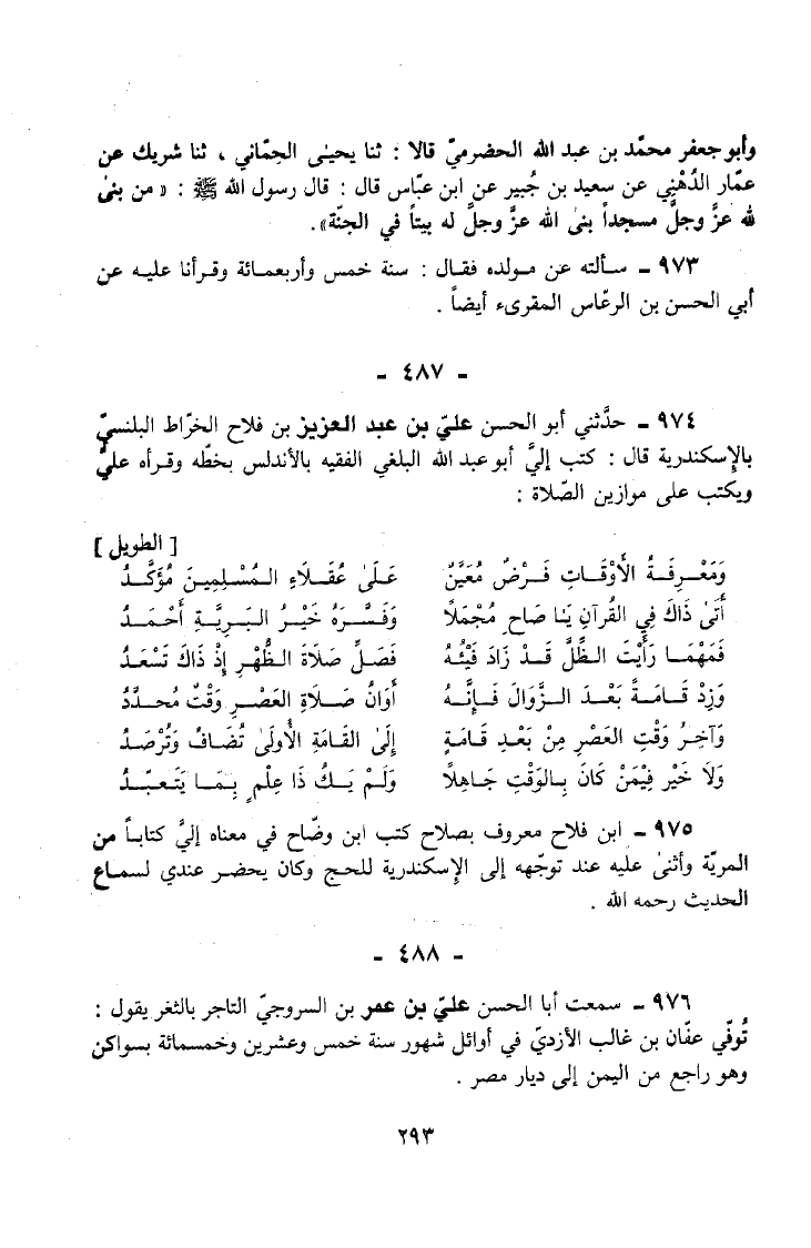 974 - حَدثنِي أَبُو الْحَسَنِ عَلِيُّ بْنُ عَبْدِ الْعَزِيزِ بْنِ فَلاحٍ الْخَرَّاطُ الْبَلَنْسِيُّ بِالْإِسْكَنْدَرِيَّةِ قَالَ كَتَبَ إِلَيَّ أَبُو عَبْدِ اللَّهِ الْبَلْغِيُّ الْفَقِيهُ بِالْأَنْدَلُسِ بِخَطِّهِ وَقَرَأَهُ عَلَيَّ وَيَكْتُبُ عَلَى مَوَازِينِ الصَّلَاةِ