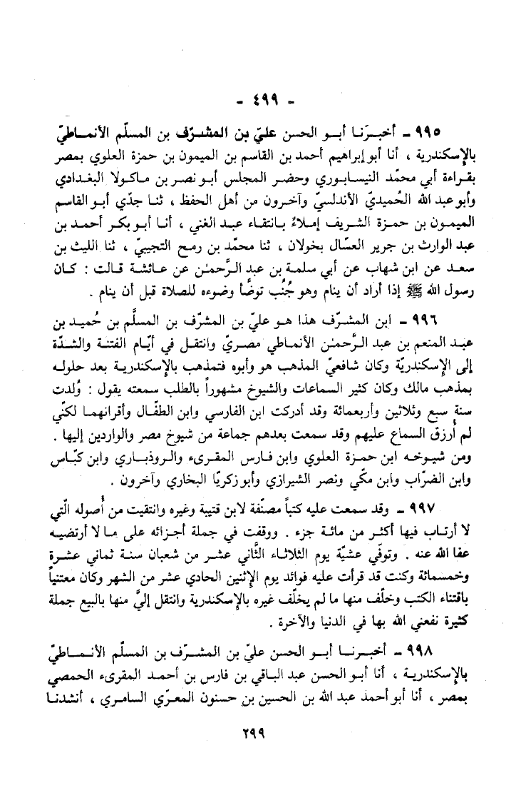 995 - أَخْبَرَنَا أَبُو الْحَسَنِ عَلَيُّ بْنُ الْمُشَرَّفِ بْنِ الْمُسْلِمِ الْأَنْمَاطِيُّ بِالْإِسْكَنْدَرِيَّةِ أَنَا أَبُو إِبْرَاهِيمَ أَحْمَدُ بْنُ الْقَاسِمِ بْنِ الْمَيْمُونِ بْنِ حَمْزَةَ الْعَلَوِيُّ بِمِصْرَ بِقَرَاءَةِ أَبِي مُحَمَّدٍ النَّيْسَابُورِيِّ وَحَضَرَ الْمَجْلِسَ أَبُو نَصْرٍ بن مَاكُولَا الْبَغْدَادِيُّ وَأَبُو عَبْدِ اللَّهِ الْحُمَيْدِيُّ الْأَنْدَلُسِيُّ وَآخَرُونَ مِنْ أَهْلِ الْحِفْظِ ثَنَا جَدِّي أَبُو الْقَاسِمِ الْمَيْمُونُ بْنُ حَمْزَةَ الشَّرِيفُ إِمْلَاءً بِانْتِقَاءِ عَبْدِ الْغَنِيِّ أَنَا أَبُو بَكْرٍ أَحْمَدُ بْنُ عَبْدِ الْوَارِثِ بْنِ جَرِيرٍ الْعَسَّالُ بِخَوْلَانَ ثَنَا مُحَمَّدُ بْنُ رُمْحٍ التُّجِيبِيُّ ثَنَا اللَّيْثُ بْنُ سَعْدٍ عَنِ ابْنِ شِهَابٍ عَنْ أَبِي سَلَمَةَ بْنِ عَبْدِ الرَّحْمَنِ عَنْ عَائِشَةَ قَالَتْ كَانَ رَسُولُ اللَّهِ صَلَّى اللَّهُ عَلَيْهِ وَسَلَّمَ إِذَا أَرَادَ أَنْ يَنَامَ وَهُوَ جُنُبٌ تَوَضَّأَ وُضُوءَهُ لِلصَّلَاةِ قَبْلَ أَنْ يَنَامَ