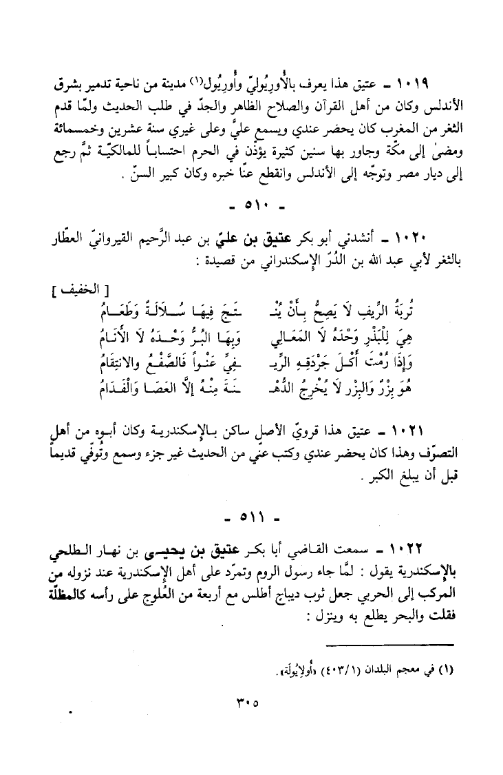 1019 - عَتِيقٌ هَذَا يُعْرَفُ بِالْأُورِيُولِيِّ وَأُورِيُولُ مَدِينَةٌ مِنْ نَاحِيَةِ تَدْمِيرَ بِشَرْقِ الْأَنْدَلُسِ وَكَانَ مِنْ أَهْلِ الْقُرْآنِ وَالصَّلَاحِ الظَّاهِرِ وَالْجِدِّ فِي طَلَبِ الْحَدِيثِ وَلَمَّا قَدِمَ الثَّغْرَ مِنَ الْمَغْرِبِ كَانَ يَحْضُرُ عِنْدِي وَيَسْمَعُ عَلَيَّ وَعَلَى غَيْرِي سَنَةَ عِشْرِينَ وَخَمْسمِائة وَمَضَى إِلَى مَكَّةَ وَجَاوَرَ بِهَا سِنِينَ كَثِيرَةً يُؤَذِّنُ فِي الْحَرَمِ احْتِسَابًا لِلْمَالِكِيَّةِ ثُمَّ رَجَعَ إِلَى دِيَارِ مِصْرَ وَتَوَجَّهَ إِلَى الْأَنْدَلُسِ وَانْقَطَعَ عَنَّا خَبَرُهُ وَكَانَ كَبِيرَ السِّنِّ