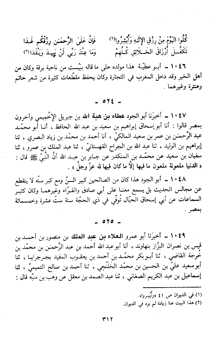 1048 - أَبُو الْجُودِ هَذَا كَانَ مِنَ الصَّالِحِينَ كَبِيرَ السِّنِّ وَمَعَ كِبَرِ سِنِّهِ لَا يَنْقَطِعُ عَنْ مَجَالِسِ الْحَدِيثِ بِلْ يَسْمَعُ مَعَنَا عَلَى أَبِي صَادِقٍ وَالْفَرَّاءِ وَغَيْرِهِمَا وَكَانَ كَثِيرَ السَّمَاعَاتِ عَنْ أَبِي إِسْحَاقَ الْحَبَّالِ تُوُفِّيَ فِي ذِي الْحِجَّةِ سَنَةَ سِتَّ عَشْرَةَ وَخَمْسمِائة بِمِصْرَ.