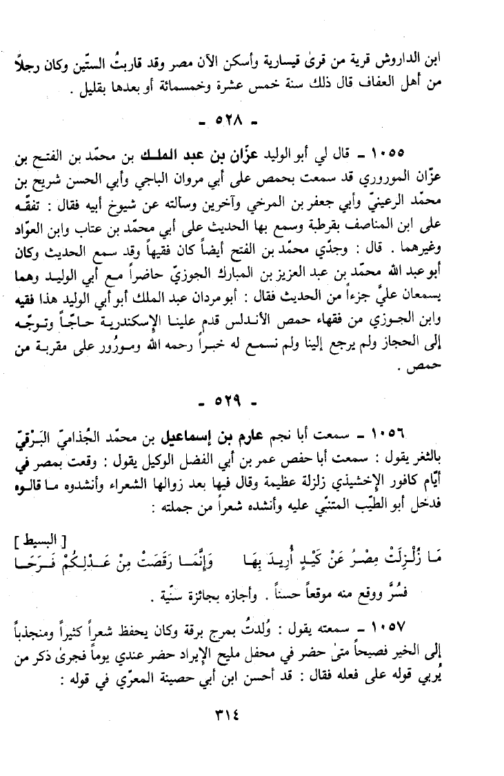 1057 - سَمِعْتُهُ يَقُولُ وُلِدْتُ بِمَرْجِ بَرْقَةَ وَكَانَ يَحْفَظُ شِعْرًا كَثِيرًا وَمُنْجَذِبًا إِلَى الْخَيْرِ فَصِيحًا مَتَى حَضَرَ فِي مَحْفَلٍ مَلِيحِ الْإِيرَادِ حَضَرَ عِنْدِي يَوْمًا فَجَرَى ذِكْرُ مَنْ يُرْبِي قَوْلَهُ عَلَى فِعْلِهِ فَقَالَ قَدْ أَحْسَنَ ابْنُ أَبِي حُصَيْنَةَ الْمَعَرِّيِّ فِي قَوْلِهِ