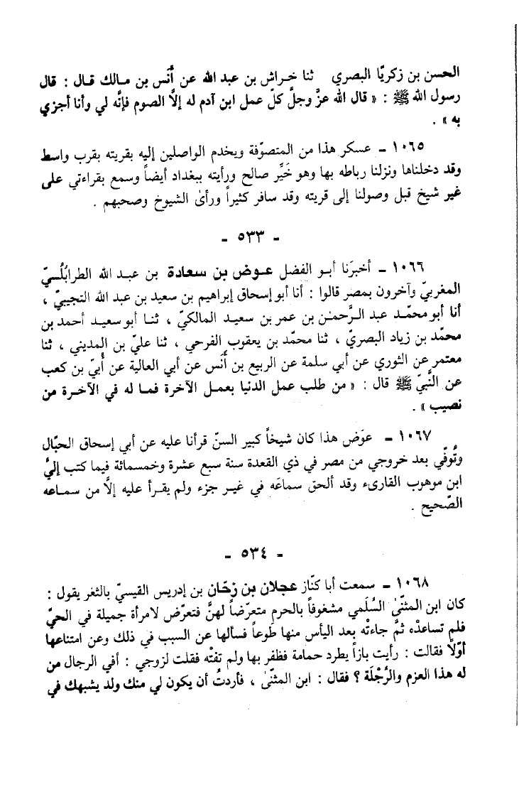 1067 - عَوَضٌ هَذَا كَانَ شَيْخًا كَبِيرَ السِّنِّ قَرَأْنَا عَلَيْهِ عَنْ أَبِي إِسْحَاقَ الْحَبَّالِ وَتُوُفِّيَ بَعْدَ خُرُوجِي مِنْ مِصْرَ فِي ذِي الْقَعْدَةِ سَنَةَ سَبْعَ عشرَة وَخَمْسمِائة فِيمَا كَتَبَ إِلَيَّ ابْنُ مَوْهُوبٍ الْقَارئ وَقَدْ أَلْحَقَ سَمَاعَهُ فِي غَيْرِ جُزْءٍ وَلَمْ يَقْرَأْ عَلَيْهِ إِلَّا مِنْ سَمَاعِهِ الصَّحِيحِ